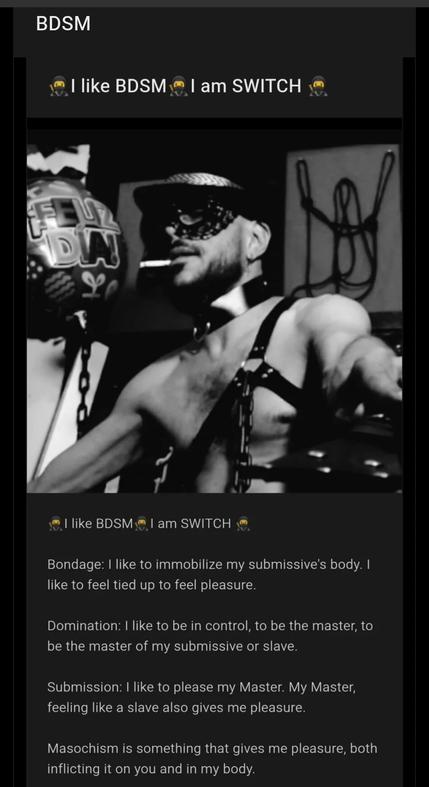 🥷 I like BDSM, BONDAGE, feeling immobile and having them enjoy my OMG, DOMINATION to tame you, be your master and your Master, SUBMISSION to fulfill your fantasies and MASOCHISM gives me a lot of pleasure that we can both enjoy. Oh, and I clarify that in BDSM I am SWITCH, I enjoy DOMINATION and SUBMISSION